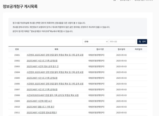 대한민국 법원 사법정보공개포털의 ‘정보공개청구 게시목록’에는 3일 오후 8시 30분 현재 ‘사건번호 2025도4697’의 로그기록 공개 신청이 1만 5000여 건 접수됐다. 신청자들은 “(이 후보의 공직선거법 위반 사건이) 이례적으로 신속하게 처리된 것에 절차적 의문이 든다”며 전자 로그 기록, 집행관 송달 내역 등의 정보 공개를 청구했다. 또, 이들은 “정보 공개를 거부할 경우 반드시 구체적인 조항과 이유를 명시해 달라”고 요구했다.