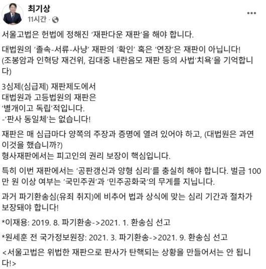최의원은 “서울고법은 위법한 재판으로 판사가 탄핵되는 상황을 만들어서는 안 된다”며 판사 탄핵 가능성을 시사했다.
