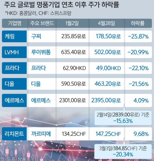 명품업계에 드리운 어둠은 주가에 고스란히 반영되는 중이다. 주요 글로벌 명품기업들의 주가가 올해 들어 부진을 면치 못하고 있다. LVMH의 경우 연초 이후 주가가 4월28일 기준 20.99%나 하락했고, 구찌를 보유한 케링그룹의 주가는 25.87%, 디올은 21.56%나 내려앉았다. 홍콩 주식시장에 상장돼 있는 프라다 역시 연초 이후 주가 하락률이 22.10%에 달한다. 까르띠에를 보유한 스위스의 리치몬트그룹과 에르메스 등은 연초를 기준으로 하면 주가가 상승했지만, ‘대목’인 밸런타인데이 이후 최고가에서 하락률을 따져보면 역시 15∼20% 가까이 주가가 빠지며 하락세가 본격화됐다. 샤넬 패션 담당 사장인 브루노 파블로프스키는 지난달 파이낸셜타임스와 인터뷰에서 “주식 시장이 어떻게 돌아가는지 지켜보면 우리 매장들의 사업 수준을 예측할 수 있다”면서 주가 하락이 저평가에 따른 것이 아닌 실제 매출부진에 의한 것이라고 고백했다.