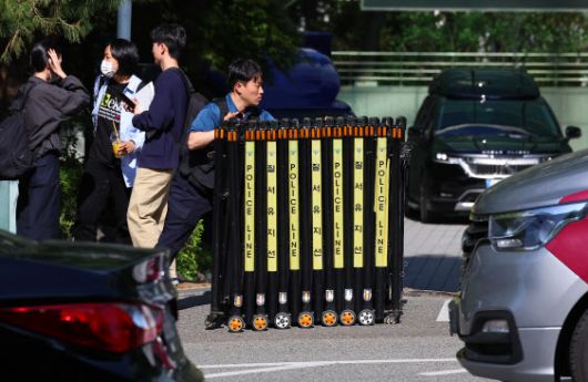 지난달 30일 서울 서초구 아크로비스타 앞에서 경찰 관계자가 검찰의 윤 전 대통령 사저에 대한 압수수색을 끝난 뒤 바리케이드를 치우고 있다.(사진=연합뉴스) |