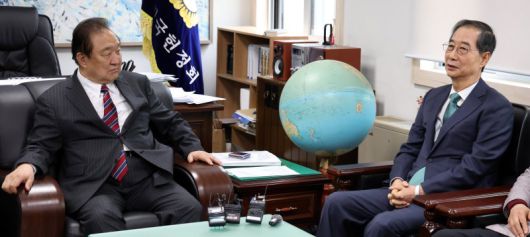 대선 출마를 선언한 한덕수 전 국무총리가 3일 오후 서울 영등포구 여의도 국회 헌정기념관에서 정대철 헌정회장을 예방하고 있다. /사진=뉴시스 |