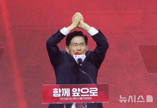 [고양=뉴시스] 고승민 기자 = 3일 경기 고양 킨텍스에서 열린 국민의힘 대선 후보 선출 전당대회에서 대선 후보로 선출된 김문수 후보가 수락연설을 하고 있다. (공동취재) 2025.05.03. photo@newsis.com |