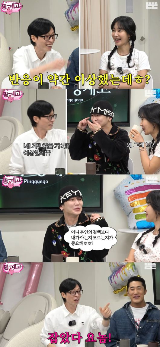 월척을 낚았다는 듯한 반응을 보이던 유재석은 박수를 치며 "얘가 요즘 이상하네?"라며 웃었고, "많이 당황했나 보다. 지금 갑자기 배에 손을 집어넣고"라고 놀렸다.