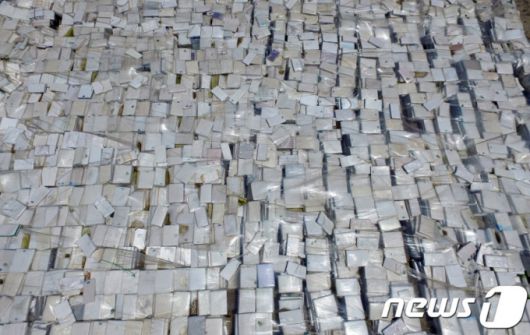 충남 당진시 당진항 야적장에 전국에서 수거된 대진침대의 라돈검출 매트리스 1만 6000여개가 쌓여 있다. 원자력안전위원회는 지역 주민들과 현장에서 매트리스 해체 작업 하는 것에 합의해 조만간 작업에 착수 할 것으로 보인다. 2018.7.19/뉴스1 (C) News1 장수영 기자 |