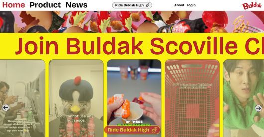 불닭닷컴에 접속하면 첫 화면부터 불닭의 캐릭터 호치와 불닭 브랜드 내 제품들이 요란하게 화면을 뒤덮고, 화면 가운데에는 '스코빌 클럽에 가입하라'(Join Buldak Scoville Culb)의 영문이 지속해서 흐르고 있다.