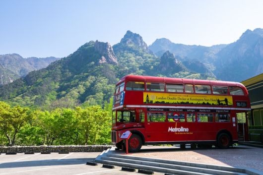 호텔 정문 입구에는 1950년대 런던 시내를 달리던 이층버스 ‘루트마스터’가 서있다. 권금성과 설악산 자락을 배경으로 하는 빨간 버스는 존재감부터 남다르다.