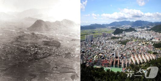김해 분성산에서 촬영한 김해 시가지 전경.(왼쪽 1995년 시군 통합 이전, 오른쪽 최근 모습. 김해시 제공. 재판매 및 DB금지) |