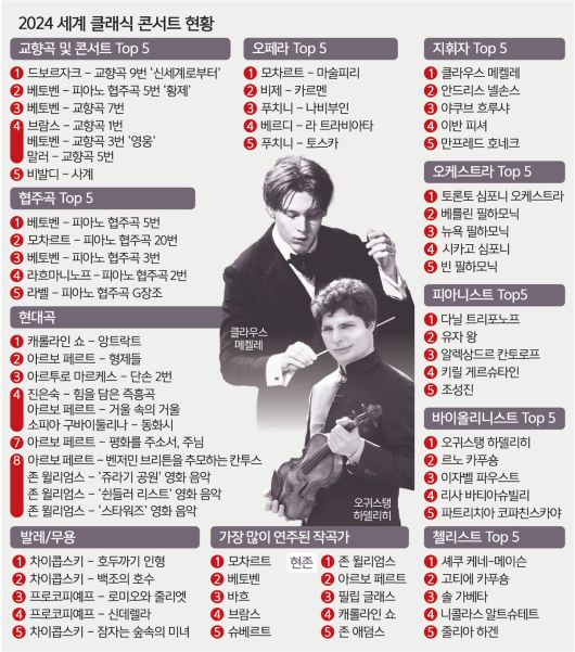 연주자 중에선 피아노 부문에서는 다닐 트리포노프, 바이올린 부문에서는 오귀스탱 아델리히, 첼로 부문에서는 셰쿠 케네-메이슨이 각각 가장 자주 콘서트홀 협연 무대에 오른 연주자로 집계됐다. 3인은 2023년에도 각 악기별 1위를 차지했던 연주자다. 다닐 트리포노프는 러시아 출신으로, 지난 10여년간 클래식 피아노계에 혜성처럼 등장해 각종 콩쿠르를 석권하고 명성을 쌓은 젊은 거장이다. 오귀스탱 아델리히는 미국과 독일을 중심으로 활동하는 연주자다. 깊이 있는 음악성과 폭넓은 레퍼토리 선택으로 정평 났다. 셰쿠 케네-메이슨은 2016년 만 17세의 나이에 올해의 BBC 영 뮤지션 상을 받으며 클래식 음악계에 등장한 젊은 연주자. 2018년 영국 왕실 해리 왕자 결혼식 축하연에 연주자로 등장하며 세계적 명성을 얻었다. 재클린 뒤프레의 엘가 협주곡 연주에 큰 영감을 받아 첼리스트가 되기로 결심했다고 한다.