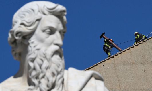 차기 교황 선출을 위한 준비작업으로 2일(현지시간) 바티칸 시스티나 성당 지붕에 로마 소방관들이 굴뚝을 설치하고 있다. 바티칸=EPA·연합뉴스 |