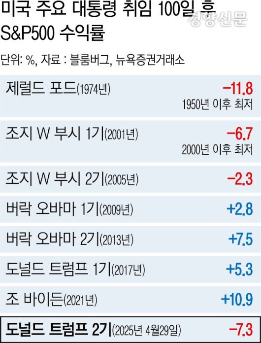 정부 취임 100일 기준으로 보면 트럼프 2기 출범 이후 S&P500은 7.3% 하락하면서 1974년 제럴드 포드 대통령(-11.8%) 이후 최악의 수익률을 기록했습니다. 트럼프 1기(+5.3%)는 물론 ‘닷컴버블’이 한창이던 2001년 당시 취임한 조지 W 부시(-6.7%) 대통령 시기보다도 부진한 성과를 기록했습니다.