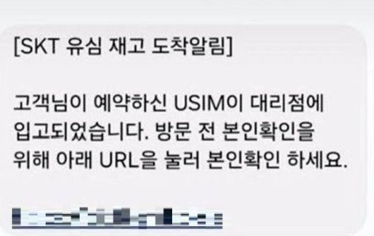 가장 대표적인 사례가 유심 재고 도착을 사칭한 스미싱이다. 예약한 유심이 도착했으니 대리점을 방문하기에 앞서 URL을 눌러 본인 확인을 해달라는 내용을 담은 사기 문자를 받았다는 고객 신고가 급증하고 있다.
