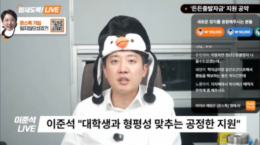 '펭귄 모자' 등 자신을 상징하는 소품을 활용하기도 한다. 이 후보는 방송 중 '펭귄 모자를 똑바로 써달라'는 요청을 받고 "머리가 뭉개질까봐 그랬다"며 고쳐쓰기도 했다. 틈틈이 "구독과 좋아요 알림설정을 부탁드린다"는 말도 빼먹지 않는다. 자체 개발한 애플리케이션(앱)이나 홈페이지 등을 통한 후원을 독려하기 위함이다. 현재 '이준석' 채널의 구독자는 6만4000여명이다. 영상당 조회수는 대개 3만~10만회에 수준이다.