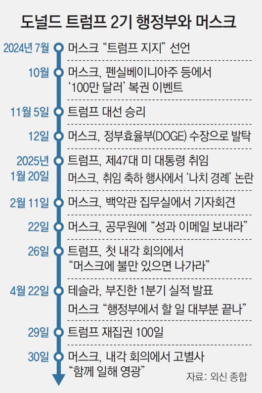 일론 머스크 정부효율부 수장(54)이 도널드 트럼프 대통령의 재집권 약 100일 만에 일선에서 물러났다. 완전히 손을 떼지는 않겠다고 밝혔으나 트럼프 행정부 내 존재감이 부쩍 줄어들 전망이다. 한때 일주일 내내 워싱턴에서 숙식하며 정부효율부 안착에 매진했던 그는 지난달 30일(현지 시간) “앞으로 정부효율부에 사용하는 시간을 ‘주 1일’ 수준으로 줄일 예정”이라고 했다.