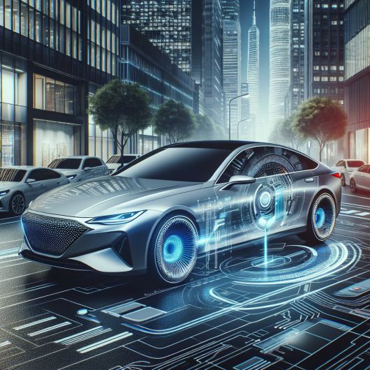 자동차 옵션의 중요성이 강조된 가운데, 미래적인 도심에서 고급 전기 자동차가 첨단 기술과 연결성을 보여주며 주행하고 있다. |