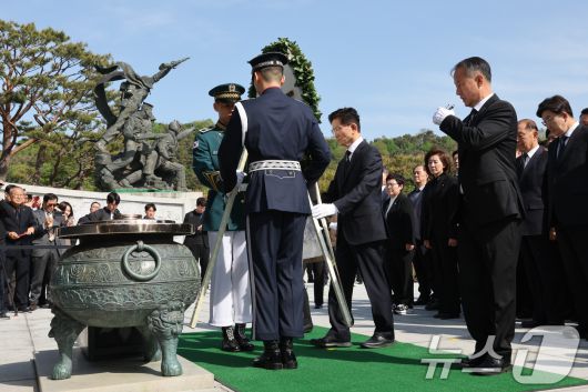 (서울=뉴스1) 안은나 기자 = 김문수 국민의힘 대통령 후보가 4일 오전 서울 동작구 국립서울현충원 현충탑에서 헌화하고 있다. 2025.5.4/뉴스1coinlocker@news1.krCopyright ⓒ 뉴스1. All rights reserved. 무단 전재 및 재배포, AI학습 이용 금지.