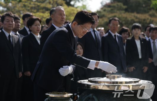 (서울=뉴스1) 안은나 기자 = 김문수 국민의힘 대통령 후보가 4일 오전 서울 동작구 국립서울현충원 현충탑에서 분향하고 있다. (공동취재) 2025.5.4/뉴스1