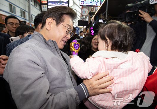 '골목골목 경청투어 : 동해안벨트편'에 나선 이재명 더불어민주당 대통령 후보가 3일 오전 강원 양양군 양양시장에서 한 아이를 바라보고 있다. 2025.5.3/뉴스1 ⓒ News1 이재명 기자 |