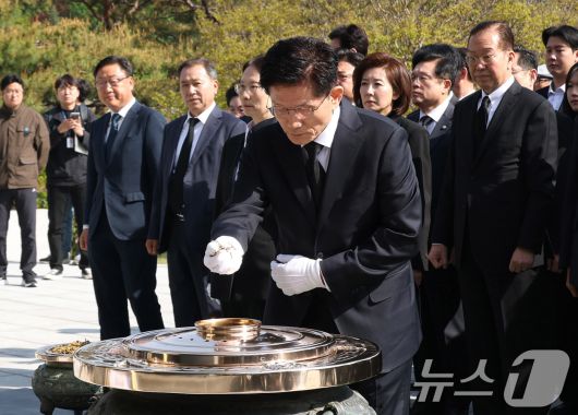 (서울=뉴스1) 안은나 기자 = 김문수 국민의힘 대통령 후보가 4일 오전 서울 동작구 국립서울현충원 현충탑에서 분향하고 있다. (공동취재) 2025.5.4/뉴스1