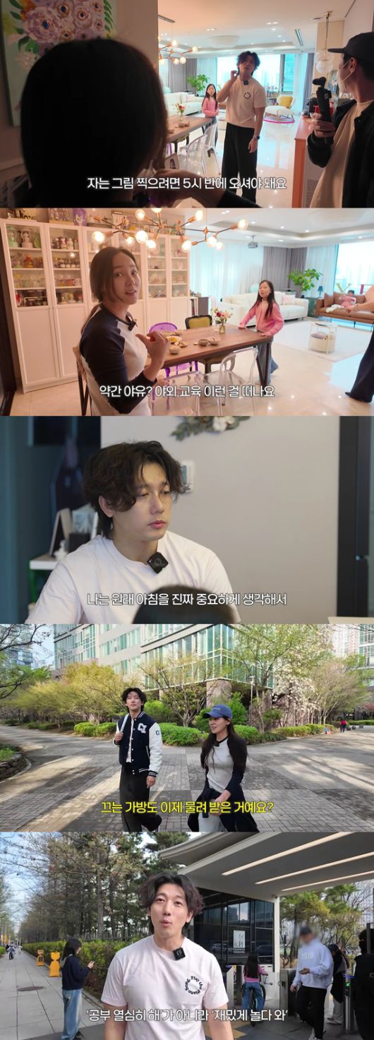 유튜브 제작진은 이른 아침부터 유진, 기태영 부부의 집을 찾았다. 예상과 달리 모두 일어나 등교 준비를 마친 모습이었다. 기태영은 "자는 그림 찍으려면 5시 반에 오셔야 된다. 얘네 등교가 8시다. 쟤(로희)는 6시에 일어났다"고 설명했다. 유진은 로희가 야외 교육을 앞두고 일찍 일어나고 있다며 부지런하게 준비했다고 덧붙였다.