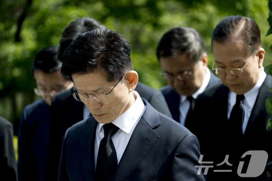 (서울=뉴스1) 안은나 기자 = 김문수 국민의힘 대통령 후보가 4일 오전 서울 동작구 국립서울현충원 박정희 전 대통령 묘역을 찾아 묵념하고 있다. (공동취재) 2025.5.4/뉴스1