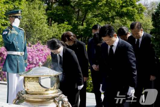 (서울=뉴스1) 안은나 기자 = 김문수 국민의힘 대통령 후보가 4일 오전 서울 동작구 국립서울현충원 박정희 전 대통령 묘역을 찾아 묵념하고 있다. (공동취재) 2025.5.4/뉴스1coinlocker@news1.krCopyright ⓒ 뉴스1. All rights reserved. 무단 전재 및 재배포, AI학습 이용 금지.