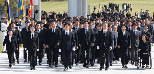 국민의힘 김문수 대선 후보가 4일 서울 동작구 국립서울현충원을 찾아 현충탑에 참배하고 있다. 연합뉴스 |