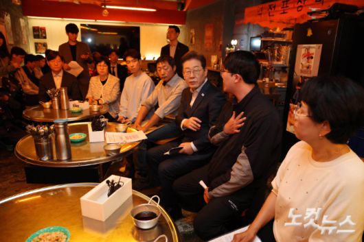 이재명 더불어민주당 대선후보가 1일 서울 종로 한 음식점에서 '민생시리즈2' 비전형 노동자 간담회를 하고 있다. 황진환 기자 |