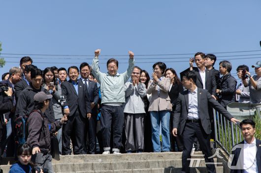 (영주=뉴스1) 이재명 기자 = '골목골목 경청투어 : 단양팔경편'에 나선 이재명 더불어민주당 대통령 후보가 4일 오전 경북 영주시 문정둔치에서 열린 2025 영주 한국선비문화축제를 찾아 시민들에게 인사하고 있다. 2025.5.4/뉴스1