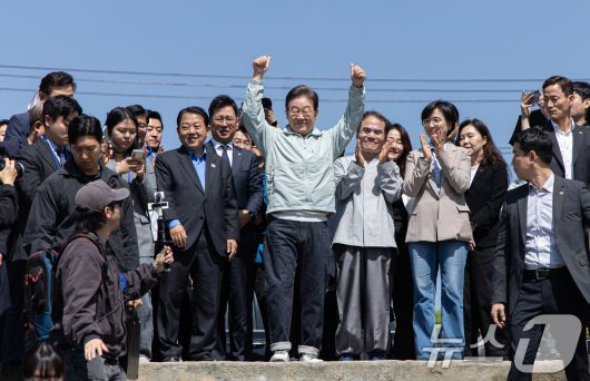 (영주=뉴스1) 이재명 기자 = '골목골목 경청투어 : 단양팔경편'에 나선 이재명 더불어민주당 대통령 후보가 4일 오전 경북 영주시 문정둔치에서 열린 2025 영주 한국선비문화축제를 찾아 시민들에게 인사하고 있다. 2025.5.4/뉴스1