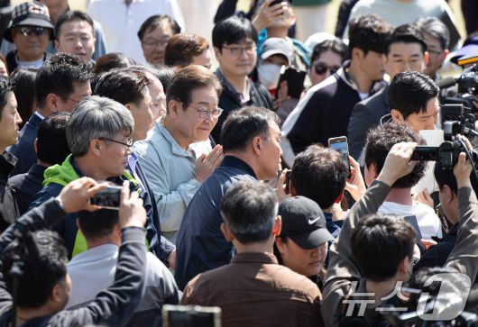 (영주=뉴스1) 이재명 기자 = '골목골목 경청투어 : 단양팔경편'에 나선 이재명 더불어민주당 대통령 후보가 4일 오전 경북 영주시 문정둔치에서 열린 2025 영주 한국선비문화축제를 찾아 시민들에게 인사하고 있다. 2025.5.4/뉴스1