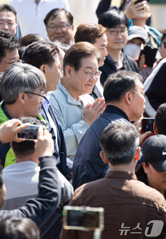 (영주=뉴스1) 이재명 기자 = '골목골목 경청투어 : 단양팔경편'에 나선 이재명 더불어민주당 대통령 후보가 4일 오전 경북 영주시 문정둔치에서 열린 2025 영주 한국선비문화축제를 찾아 시민들에게 인사하고 있다. 2025.5.4/뉴스1