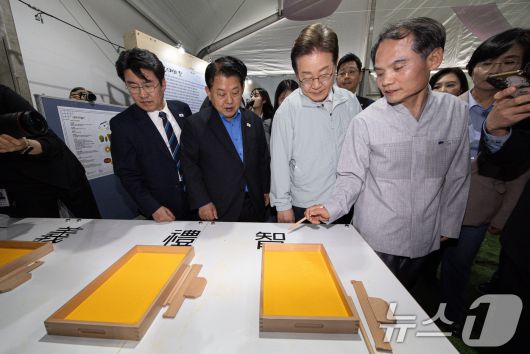 (영주=뉴스1) 이재명 기자 = '골목골목 경청투어 : 단양팔경편'에 나선 이재명 더불어민주당 대통령 후보가 4일 오전 경북 영주시 문정둔치에서 열린 2025 영주 한국선비문화축제에서 갓생관을 둘러보고 있다. 2025.5.4/뉴스1