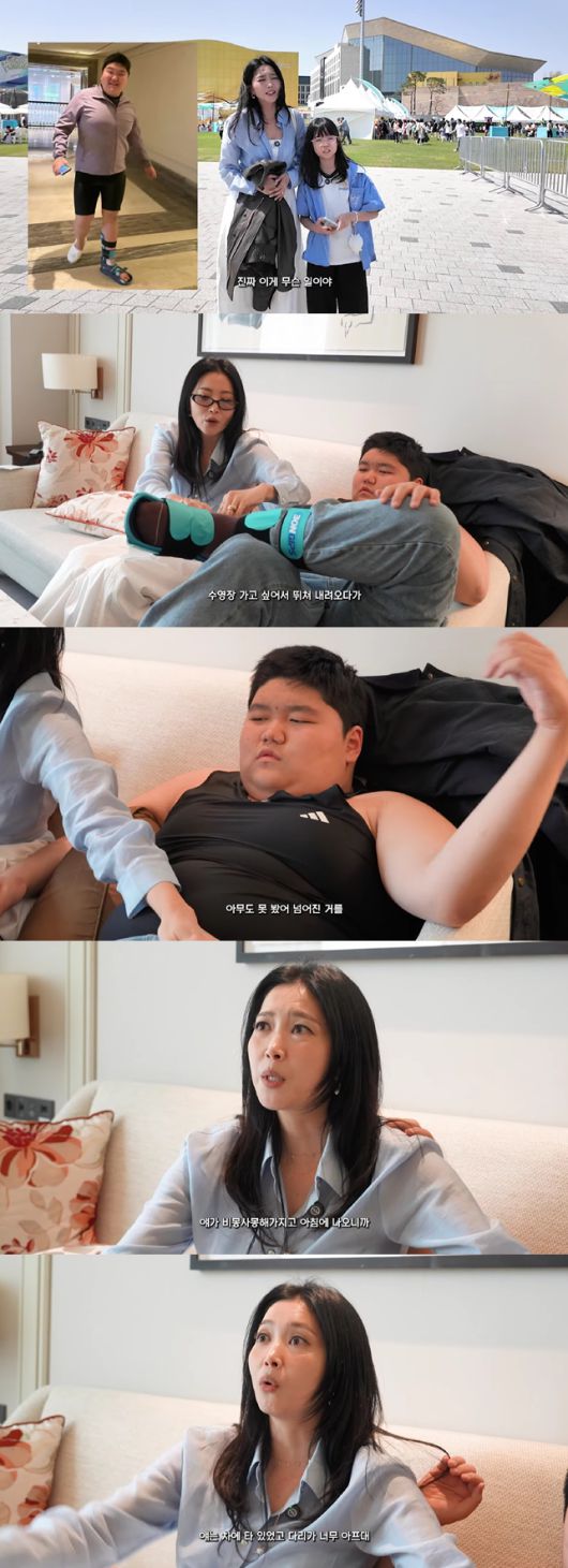 행사를 마치고 호텔로 돌아온 오윤아는 다리에 깁스를 한 채 절뚝이며 걸어오는 아들 민이에게 "괜찮아?"라고 말했다. 다친 이유를 묻자 "넘어져서 많이 아팠다. 병원 다녀왔다"고 답했다.