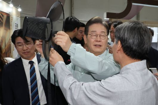 이재명 더불어민주당 대선 후보가 대선을 한 달 앞둔 4일 '골목골목 경청투어 : 단양8경편' 첫 방문지인 경북 영주시 문정둔치에서 열린 한국선비문화축제장을 찾아 갓 등 전시물을 둘러보고 있다. 연합뉴스. |