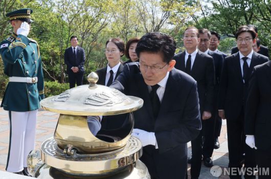 [서울=뉴스핌] 이호형 기자 = 김문수 국민의힘 대통령선거 후보가 4일 오전 서울 동작구 국립서울현충원 김대중 전 대통령 묘역을 찾아 분향하고 있다. 2025.05.04 leemario@newspim.com