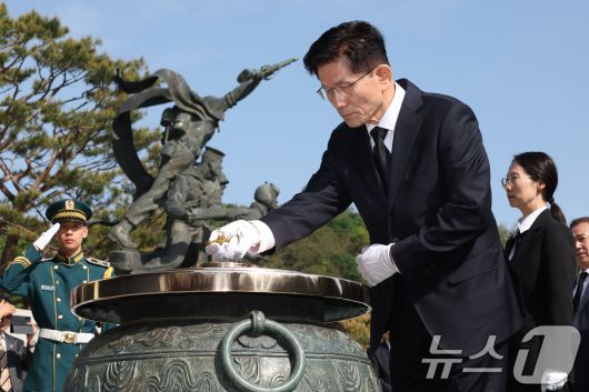김문수 국민의힘 대통령 후보가 4일 오전 서울 동작구 국립서울현충원 현충탑에서 분향하고 있다. 2025.5.4/뉴스1 ⓒ News1 안은나 기자 |