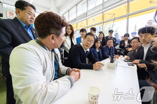 (예천=뉴스1) 이재명 기자 = '골목골목 경청투어 : 단양팔경편'에 나선 이재명 더불어민주당 대통령 후보가 4일 오전 경북 예천군 도청 신도시에 위치한 분식점에서 상인회 관계자와 주민들의 의견을 청취하고 있다. 2025.5.4/뉴스1
