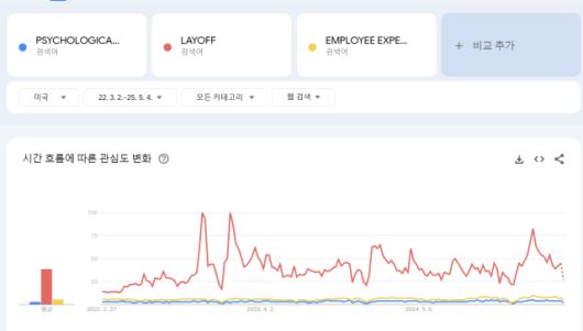 조직 내에서 통용되는 ‘심리적 안전감(Psychological Safety)’는 팬데믹 이후 2022년 하반기 시작된 경기 침체로 빅테크가 앞다투어 대규모 정리 해고를 시행한 시점부터 통용되는 빈도가 늘어났다. 이는 구글 트렌드에서도 확인할 수 있는 대목이다. 정리 해고에 대한 언급량이 늘어난 시기 전후로 심리적 안전감에 대한 언급량이 늘어나는 경향성을 보인다. 이보다 더 기간을 늘려 보면 팬데믹 이후 원격 근무로 인한 고립감이 늘어나고 생성형 AI붐으로 인해 개인의 업무 효능감이 위협 받고 노동 시장의 불안정성이 더해지면서 직원들의 불안을 최소화하고 업무에 몰입할 수 있는 경험중심적 조직에 대한 니즈가 커진 것에 가깝다.