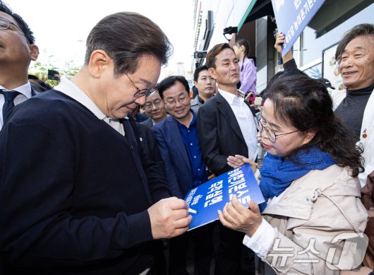 (예천=뉴스1) 이재명 기자 = '골목골목 경청투어 : 단양팔경편'에 나선 이재명 더불어민주당 대통령 후보가 4일 오전 경북 예천군 도청 신도시 일대를 찾아 지지자 요청으로 손팻말에 서명하고 있다. 2025.5.4/뉴스12expulsion@news1.krCopyright ⓒ 뉴스1. All rights reserved. 무단 전재 및 재배포, AI학습 이용 금지.