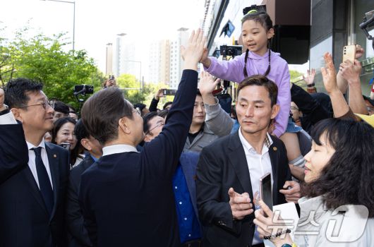 (예천=뉴스1) 이재명 기자 = '골목골목 경청투어 : 단양팔경편'에 나선 이재명 더불어민주당 대통령 후보가 4일 오전 경북 예천군 도청 신도시 일대를 찾아 한 아이와 하이파이브를 하고 있다. 2025.5.4/뉴스12expulsion@news1.krCopyright ⓒ 뉴스1. All rights reserved. 무단 전재 및 재배포, AI학습 이용 금지.