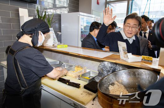 (예천=뉴스1) 이재명 기자 = '골목골목 경청투어 : 단양팔경편'에 나선 이재명 더불어민주당 대통령 후보가 4일 오전 경북 예천군 도청 신도시에 위치한 김밥집에서 음식을 맛본 후 인사하며 나가고 있다. 2025.5.4/뉴스12expulsion@news1.krCopyright ⓒ 뉴스1. All rights reserved. 무단 전재 및 재배포, AI학습 이용 금지.