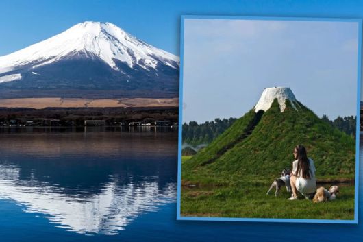 이 언덕은 지난해 잔디를 심어 조성됐고, 꼭대기는 후지산을 연상시키기 위해 하얀 페인트로 칠해졌다.