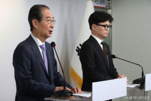 한덕수 국무총리와 한동훈 국민의힘 대표가 8일 오전 서울 여의도 당사에서 대국민 공동 담화를 발표하고 있다. 2024.12.8/사진=뉴스1 /사진=(서울=뉴스1) 이광호 기자 |