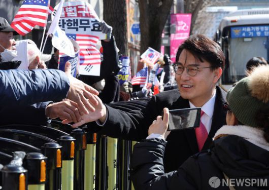 [서울=뉴스핌] 김학선 기자 = 윤상현 국민의힘 의원이 17일 서울 종로구 헌법재판소 앞에서 윤석열 대통령 탄핵반대 시위를 벌이고 있는 지지자들을 격려하며 악수를 나누고 있다. 2025.02.17 yooksa@newspim.com |