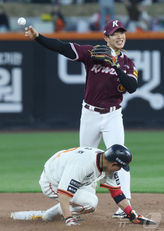 11일 대전 한화생명볼파크에서 열린 '2025 신한 SOL 뱅크 KBO리그' 한화 이글스와 키움 히어로즈의 경기에서 2회초 1사 1,2루에서 한화 황영묵 내야땅볼에 1루주자 심우준이 2루에서 키움 송성문에 아웃되고 있다. 2025.4.11/뉴스1 ⓒ News1 김기남 기자