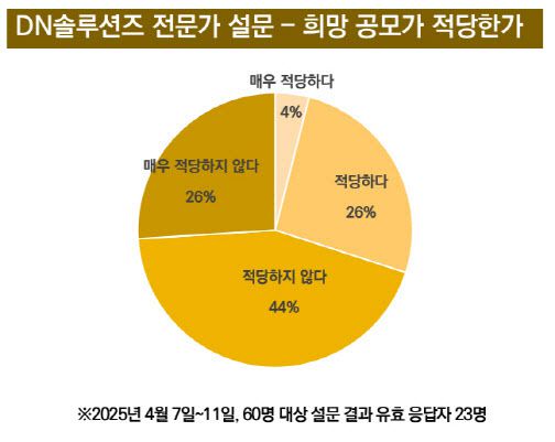 한편 이데일리가 지난달 7일부터 11일까지 펀드매니저·애널리스트 등 시장참여자 60명을 대상으로 ‘IPO 전문가 서베이’를 진행한 결과에서도 유효응답자 23명 중 17명이 DN솔루션즈의 공모가에 대해 “적당하지 않다”고 지적했다. 공모가가 합리적이지 않다고 본 가장 큰 이유로 ‘주가수익비율(PER) 멀티플 25.18배는 너무 높게 책정됐다’가 꼽혔다. 공모가 수준이 적절하지 않다고 답한 응답자 중 절반에 가까운 42%가 멀티플을 문제 삼은 것이다.