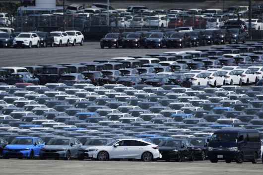 지난 8일 일본 요코하마 한 항구에서 수출 차량들이 모여 있다. AP 연합뉴스 |