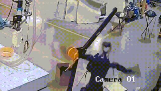 이에 연구원은 놀란 표정으로 몸을 피했고 로봇이 매달려 있던 크레인을 뒤로 잡아당긴 뒤에야 로봇은 움직임을 멈췄다.