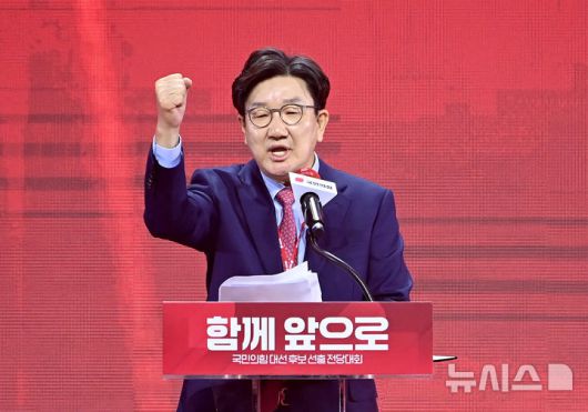 [고양=뉴시스] 국회사진기자단 = 3일 경기 고양 킨텍스에서 열린 국민의힘 대선 후보 선출 전당대회에서 권성동 원내대표가 인사말을 하고 있다. 2025.05.03. photo@newsis.com |