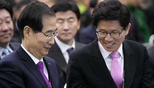 2012년 경기도청 대회의실에서 만난 한덕수·김문수. 연합뉴스 자료사진 |